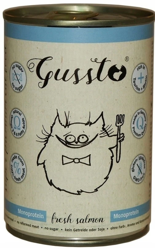Pełnowartościowa, kompletna i znakomicie zbilansowana karma superpremium dla kotów. Produkowana jest w 100% z najwyższej jakości świeżego mięsa w wysokim standardzie odpowiadającym wymaganiom żywności dla ludzi. Gussto to esencja dobrego i zdrowego żywienia. Zawiera bardzo dużo mięsa idealnie odpowiadając specyficznym wymaganiom pokarmowym kotów. Jest to karma monobiałkowa, a więc holistyczna, lekkostrawna i bardzo dobrze przyswajalna polecana również kotom o wrażliwym przewodzie pokarmowym. Stosowana także w dietach wykluczających przy alergiach pokarmowych. Znakomicie zrównoważony stosunek wapń/fosfor minimalizuje ryzyko chorób układu moczowego i nerek.