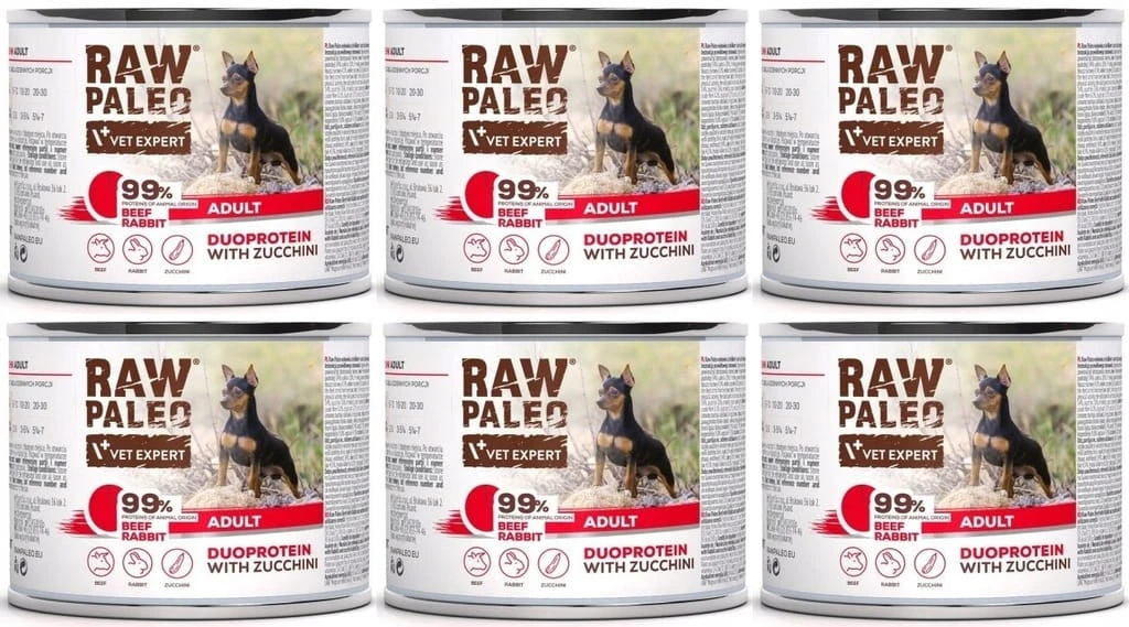 Karma mokra RAW PALEO DUOPROTEIN wołowina z królikiem i cukinią dla psów dorosłych to pełnoporcjowa, zbilansowana dieta przeznaczona dla psów od ukończenia 1. roku życia. Jest to karma duoproteinowa co oznacza, że zawiera dwa źródła białka. Wołowina w połączeniu z królikiem, zapewniają różnorodność aminokwasów i optymalne wsparcie dla zdrowia Twojego psa. Receptura nie zawiera zbóż (grain-free) ani konserwantów. Dodatek cukinii jest doskonałym źródłem potasu i witaminy C.